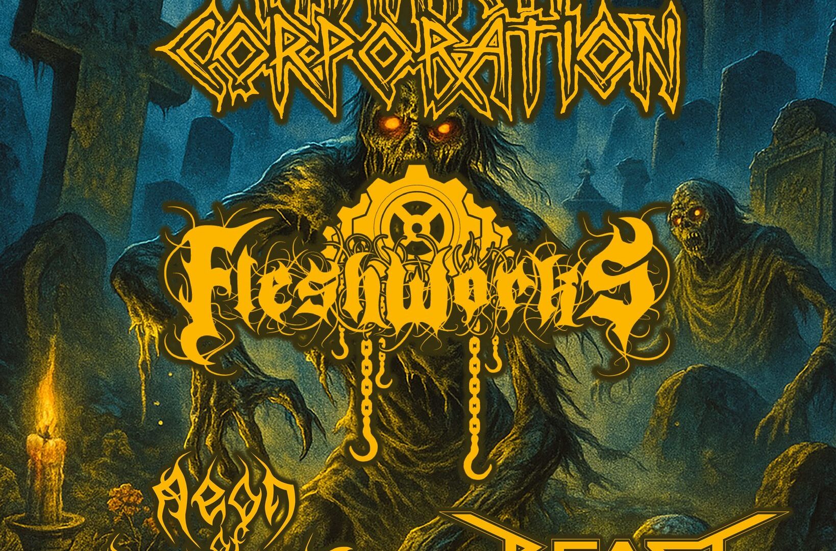Die Gastgeber, Flashworks, betreten die Bühne und damit auch der Mann mit der Lederschürze. Wie immer von seinem, von unten kommenden grünen Licht angestrahlt, mimet er den sympathischen Serienmörder aus der Nachbarschaft. „Shadows“, „Cannibal Cave“ und „Dead Men Working“ sind das eröffnende Triple. „Death By Autopsy“ klingt nach einer Todesart die man nicht erleben möchte. Vor der Bühne gibt es die ersten zaghaften versuche eines Mosh- und Circle Pits und die Band beendet ihren Gig mit dem, quasi, Titeltrack des Festivals. „Awaking Of The Ghouls“.